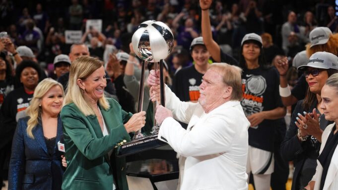 La comisionada de la WNBA, Cathy Engelbert, tuvo una gran recepción por parte de los fanáticos cuando tomó el micrófono para presentar a Las Vegas Aces su trofeo de campeonato el viernes por la noche.