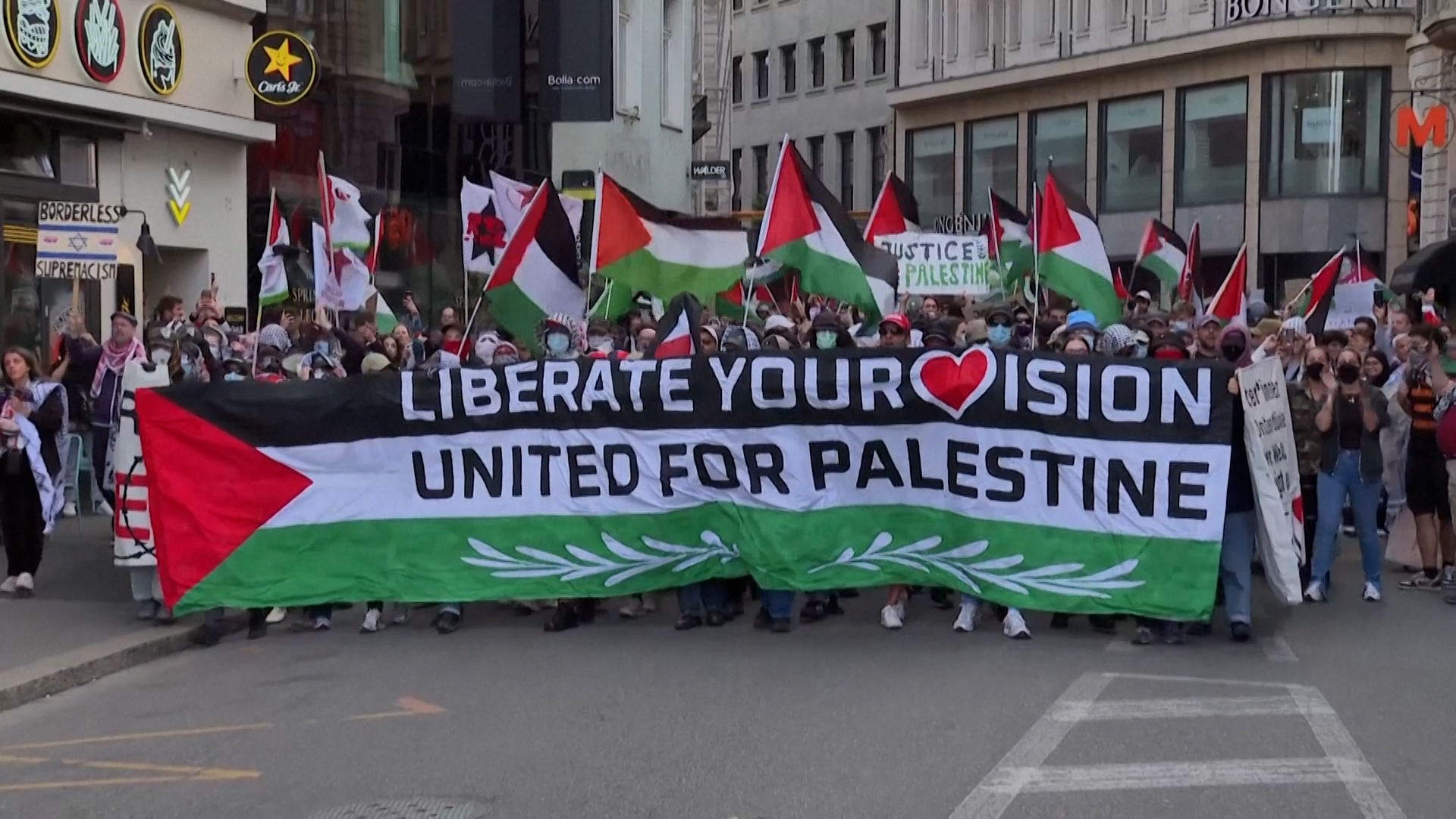 Os manifestantes foram agredidos e arrastados para gritar ‘Palestina Livre’ e elevar a bandeira palestina durante o desempenho de Israel na final do Eurovision. Do lado de fora, a polícia atacou manifestantes que disseram que a violação de Israel do direito internacional em Gaza deveria tê -los descartado.